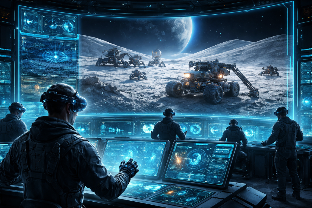 Operadores telecontrolando robots en base lunar usando sistemas EDN