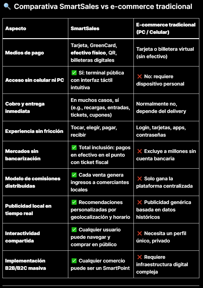 SmartSales supera las limitaciones actuales del e-commerce tradicional (desde casa o celular) por varias ventajas diferenciales que lo convierten en un modelo híbrido revolucionario, especialmente atractivo para mercados emergentes, comercios físicos y consumidores desconectados del sistema bancario formal.