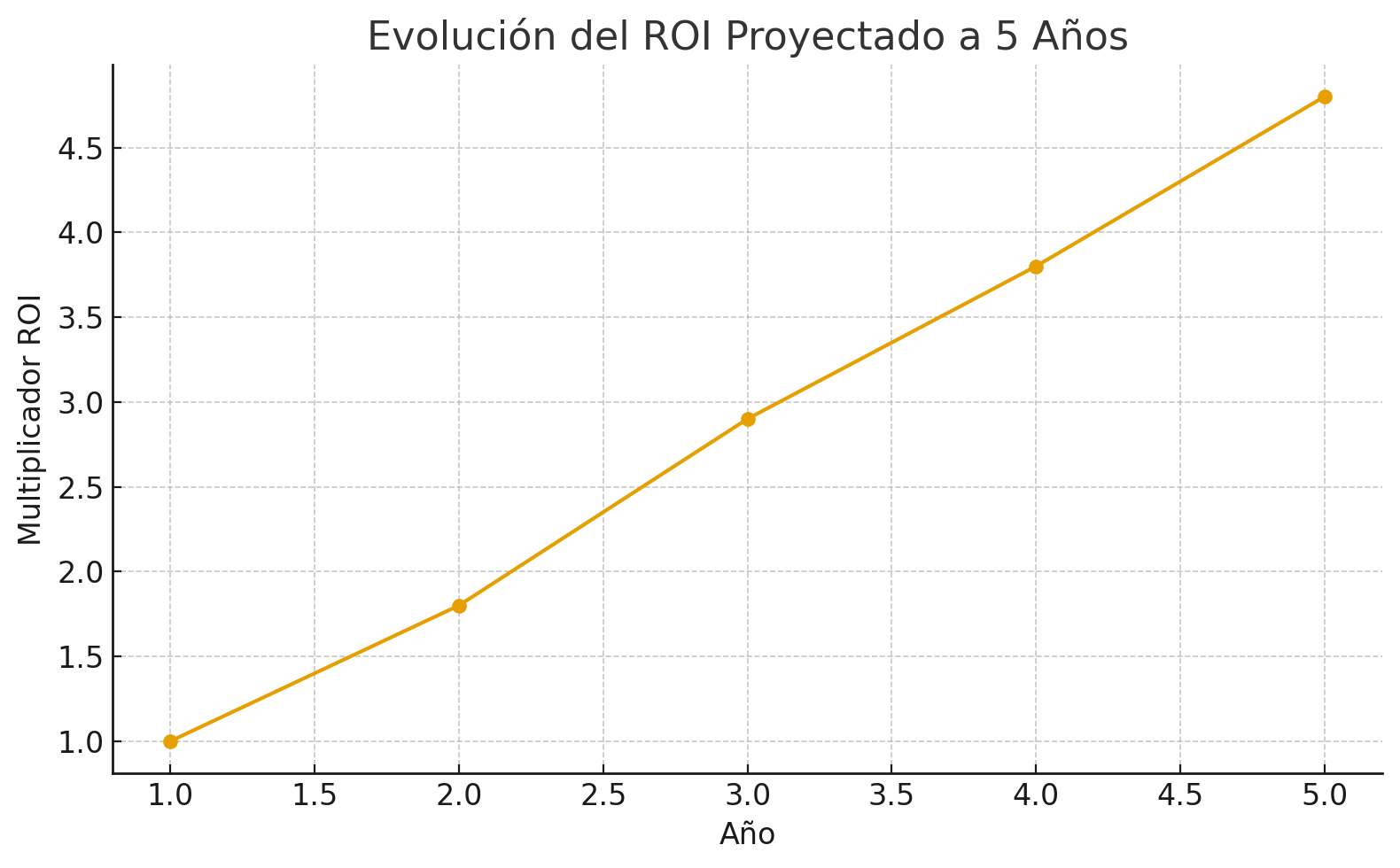 Evolución del ROI a 5 años: indica una rentabilidad progresiva hasta 4,8× del capital invertido.