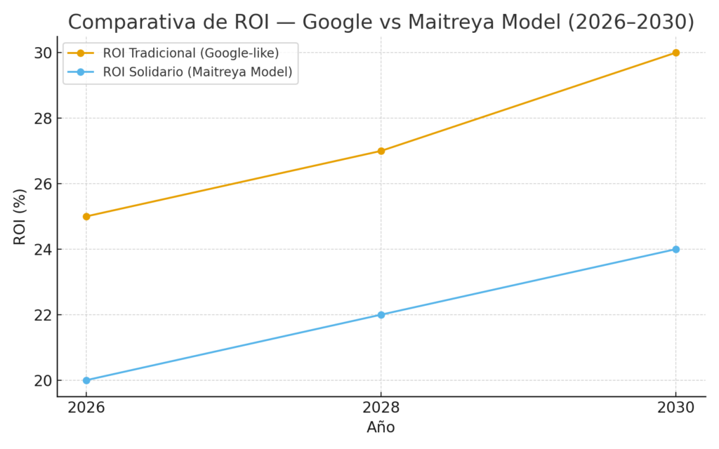 Los modelos de retorno (ROI) se estiman tomando como referencia el margen operativo neto de Google Ads ≈ 25 %, ajustado a un esquema de redistribución solidaria donde el 20 % neto se canaliza a programas ecológicos, artísticos y humanitarios.