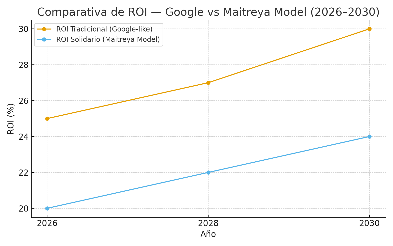 AñoEscenario base (facturación)Participación estimada del mercado globalROI neto (tradicional)ROI neto solidario (Maitreya Model)Inversión acumulada requerida