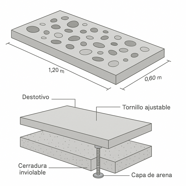 Diseñado para instalación y desmontaje sin rotura, incorpora tornillos ajustables para nivelación y cerraduras de seguridad inviolables bajo custodia del municipio.