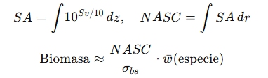 - Estimador de biomasa con ecuaciones acústicas estándar y calibración INIDEP (ver §4).
