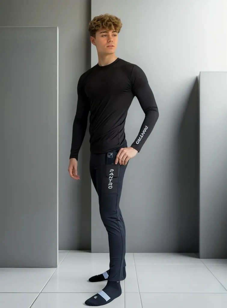 • Hombre: conjunto térmico/compresión (manga larga + calza con bolsillo lateral). Marca vertical en pierna y antebrazo para alta lectura en foto/video. Paleta base: negro grafito, azul noche, gris marino; acentos en blanco. (Imagen ref: calza hombre).
