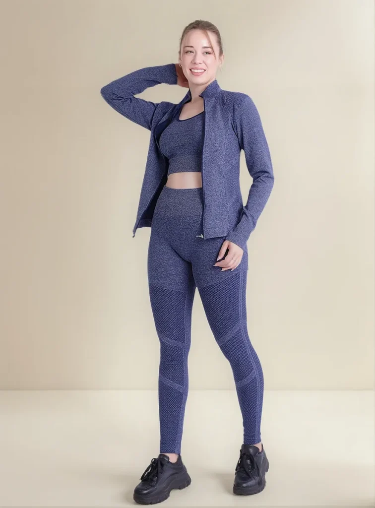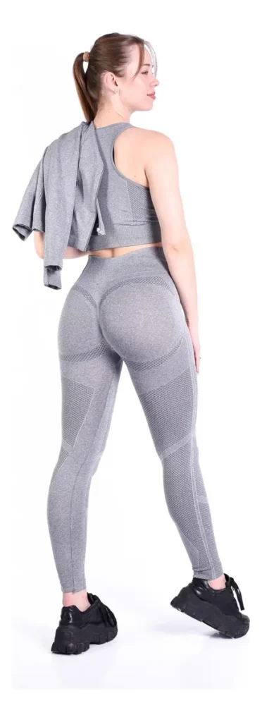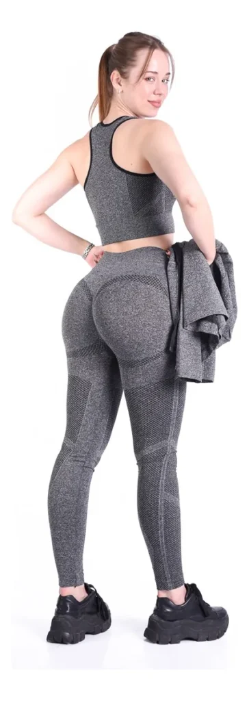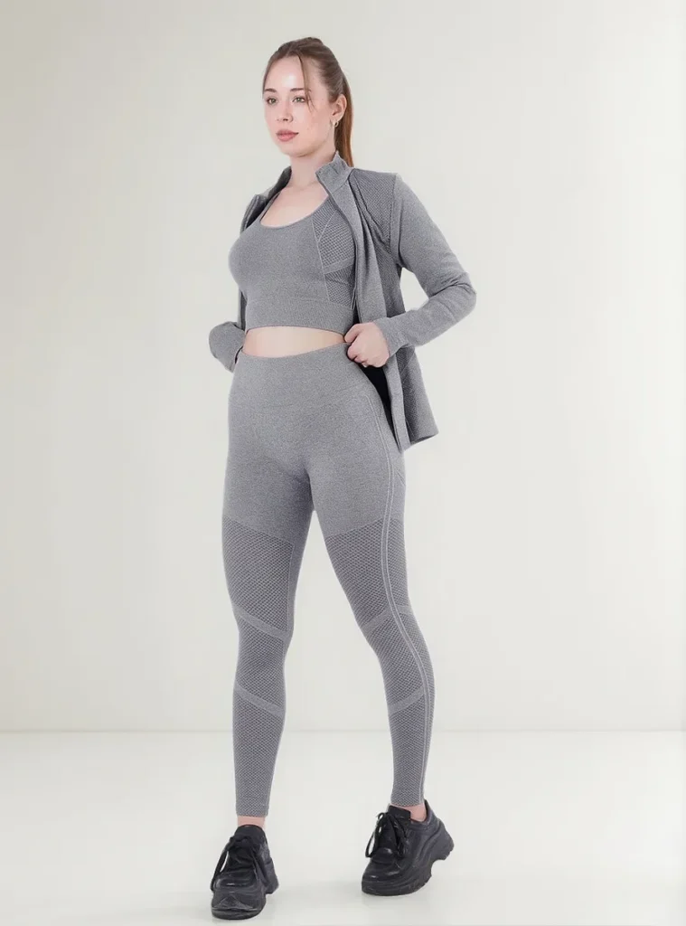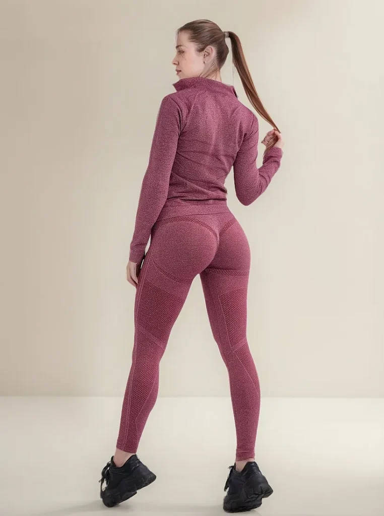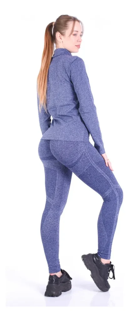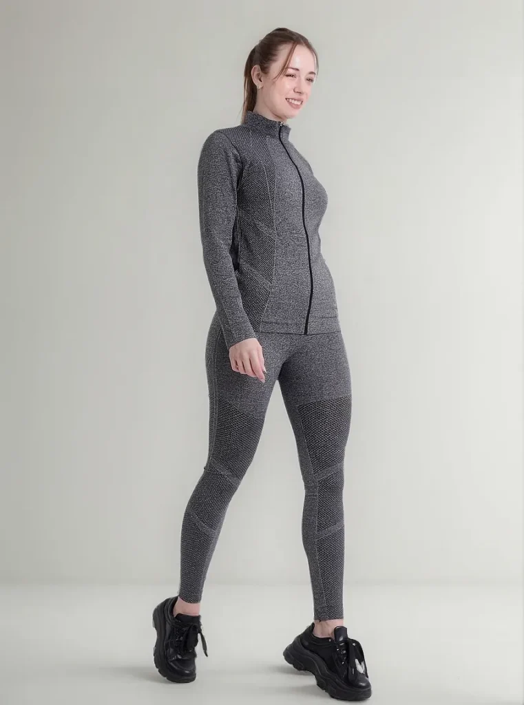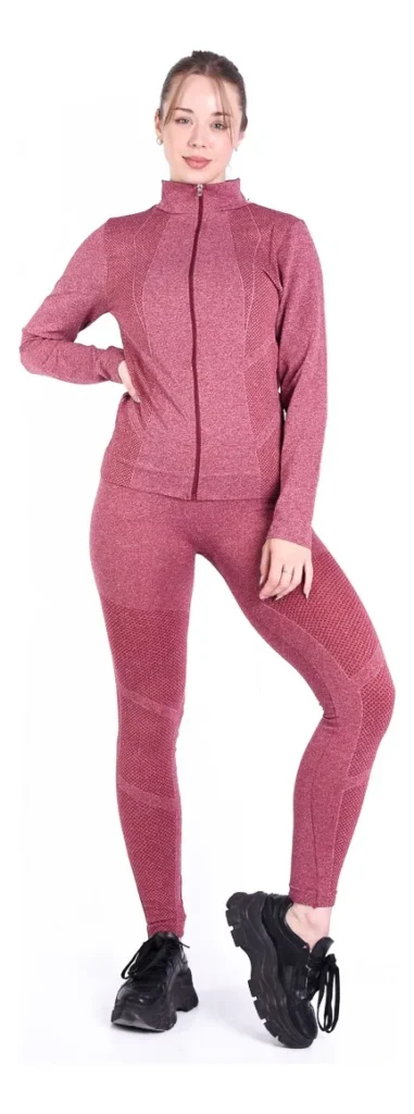 • Mujer: conjunto seamless con campera y calza (tejido texturizado). Paleta: borgoña, gris malva, índigo, negro. (Imagen ref: conjunto mujer).