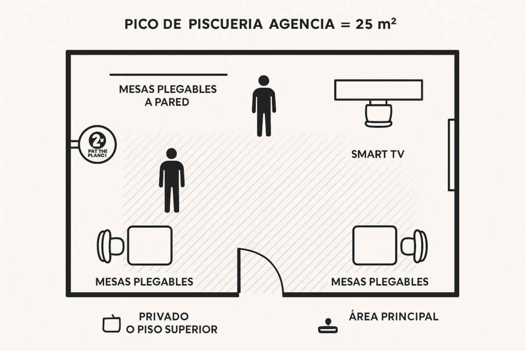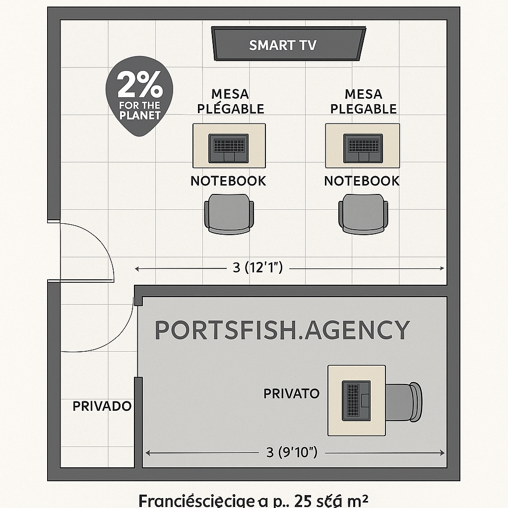 • 🔁 Versatilidad espacial: mesas plegables = showroom de día, aula/briefing de tarde.