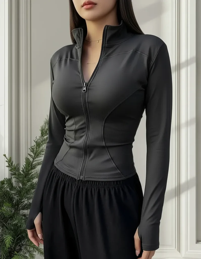 - Mujer: conjunto seamless con campera y calza (tejido texturizado). Paleta: borgoña, gris malva, índigo, negro. (Imagen ref: conjunto mujer).