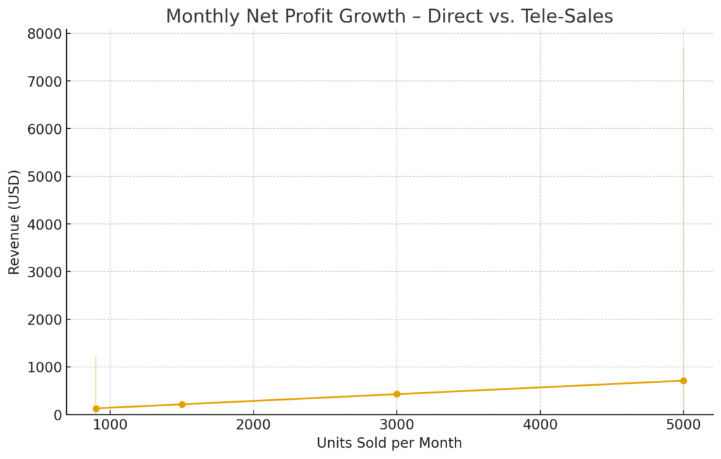 Even a modest tele-sales network adds +9% to +13% extra monthly net profit in Stage 1 without increasing fixed costs or staff.