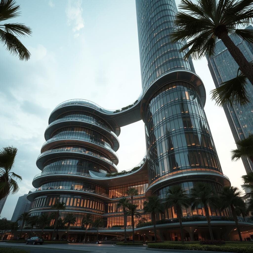 - Fachada curtain wall dorada: vidrio espejado con micropartículas metálicas oro + paneles de aluminio anodizado champagne.