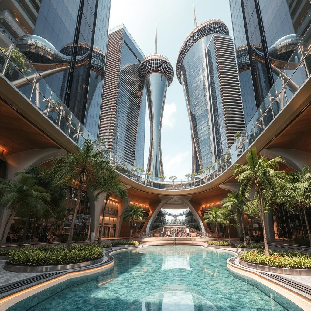 - Interiores bio-tech: materiales acústicos, iluminación LED inteligente, climatización VRF, pisos antirreflexivos.