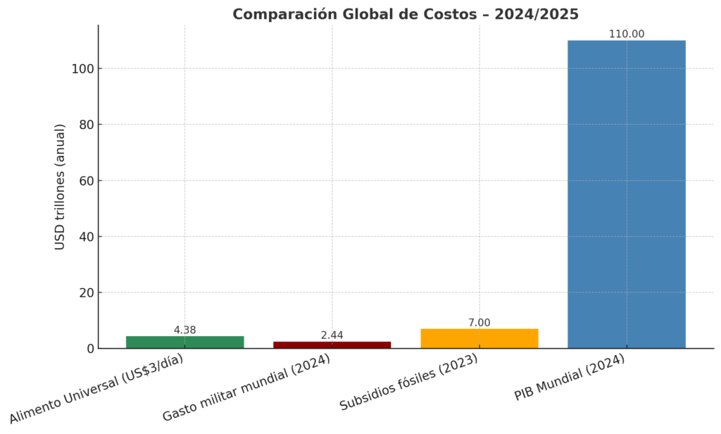 El Alimento Universal (US$3/día) aparece claramente como un esfuerzo mucho menor que los subsidios fósiles y equivalente a apenas el doble del gasto militar global.