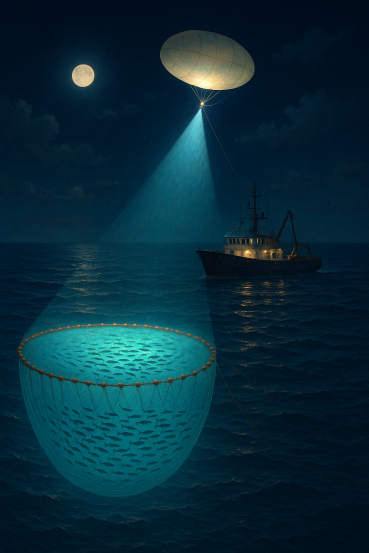 Mini-dirigibles (aerostatos cautivos) con luz LED espectral para atraer calamar (Illex/Loligo), amarrados por cable a cabrestantes en cubierta. La luz elevada concentra el cardumen sobre un “corral” superficial delimitado por redes de levantamiento de poca caída (lift-net), activadas en el momento óptimo. Objetivo: multiplicar tasa de captura por unidad de tiempo y combustible respecto del jigging con brazos metálicos y lámparas a ras del agua.