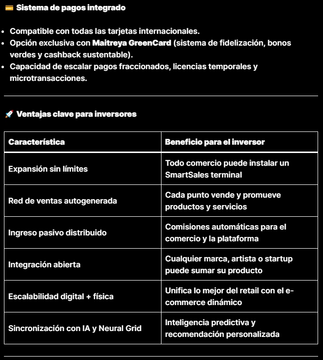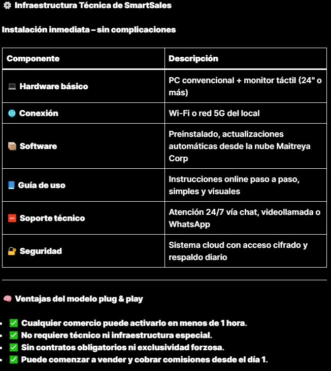 SmartSales es una red planetaria de terminales táctiles inteligentes conectadas a la nube Maitreya MacroMedia Corp, diseñadas para transformar cada comercio, quiosco o espacio público en un punto de venta digital interactivo y generador automático de comisiones.