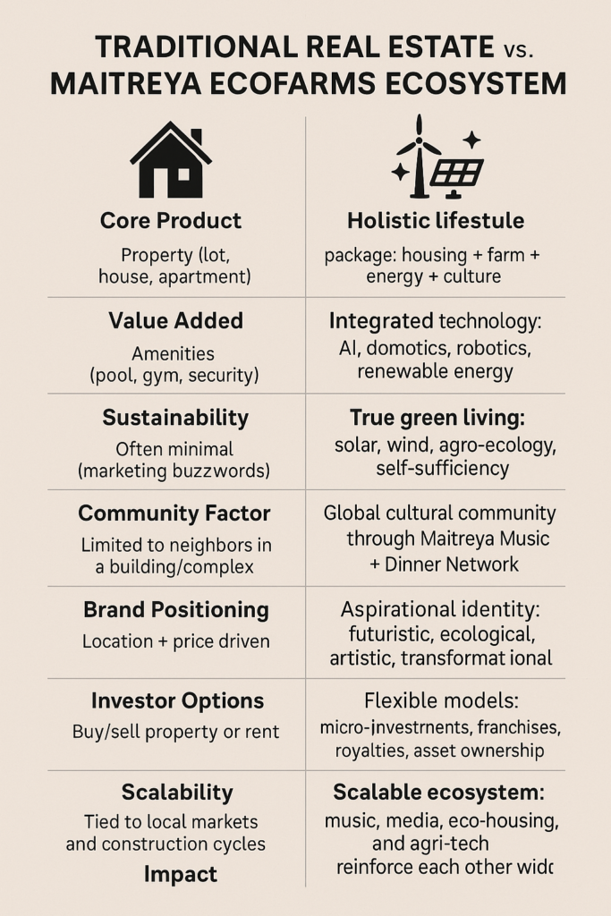 | Aspect | Traditional Real Estate | Maitreya EcoFarms Ecosystem |