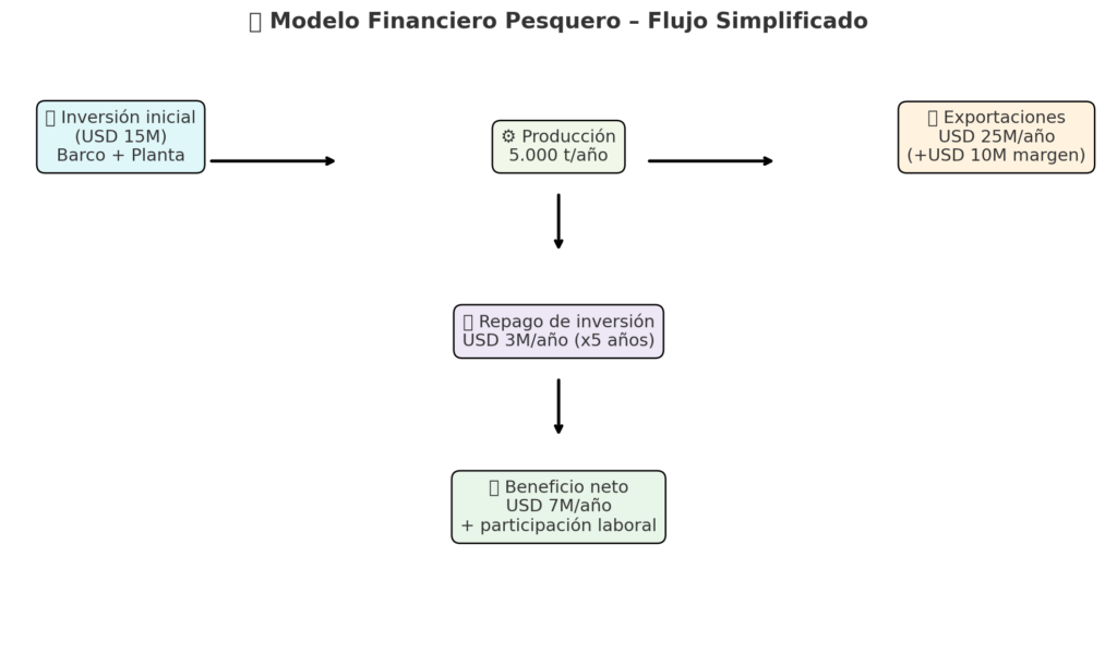 - La producción exportada funciona como mecanismo de repago: los barcos y plantas se pagan con pescado procesado y vendido en el mercado internacional.