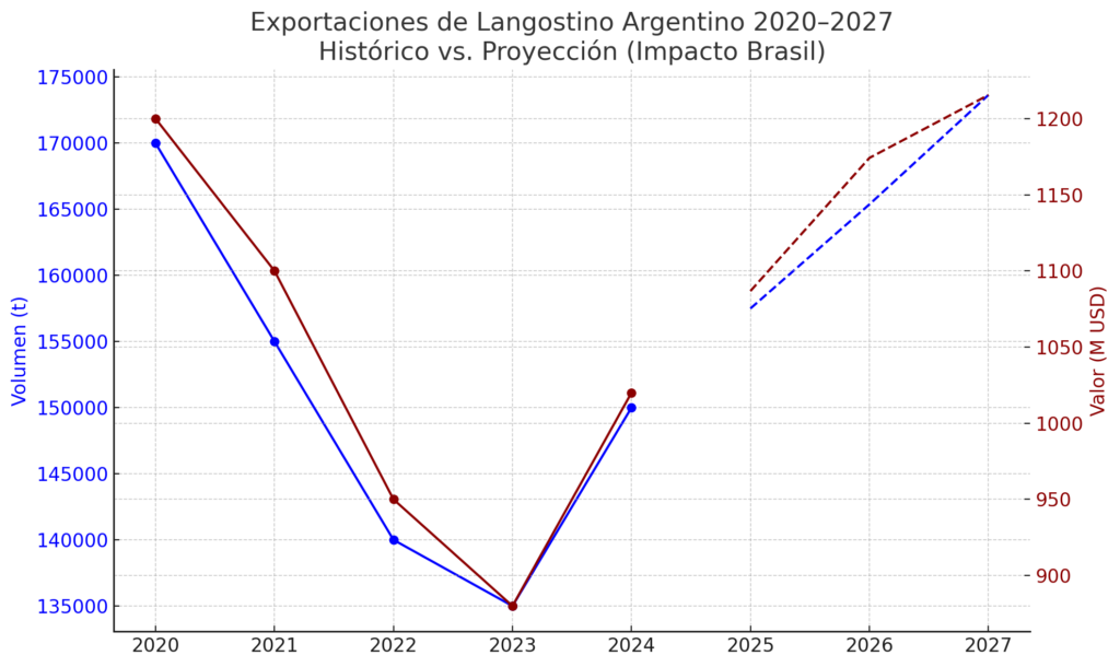 Proyección 2025–2027 de las exportaciones de langostino argentino, incorporando el impacto del nuevo mercado brasileño.