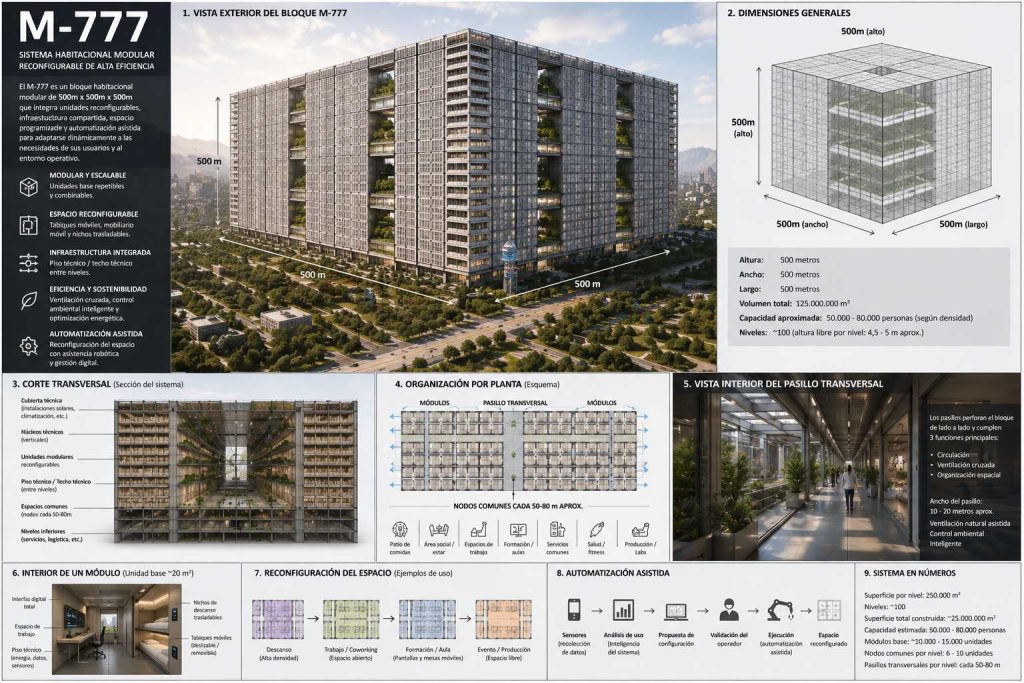 El desarrollo de M-777 se plantea en fases progresivas tipo MVP: se inicia con un bloque de aproximadamente 100 metros por lado y de altura, que permite validar diseño, operación y sistemas constructivos en condiciones reales. A partir de ese primer nodo, el sistema escala de forma incremental a 200, 300 y 400 metros, incorporando mejoras basadas en datos y experiencia acumulada, hasta alcanzar el modelo completo de 500 metros por lado y altura. Este enfoque permite ajustar el know-how, optimizar la tecnología constructiva y perfeccionar el diseño en cada etapa, reduciendo riesgos y asegurando viabilidad técnica y operativa en la escala final.